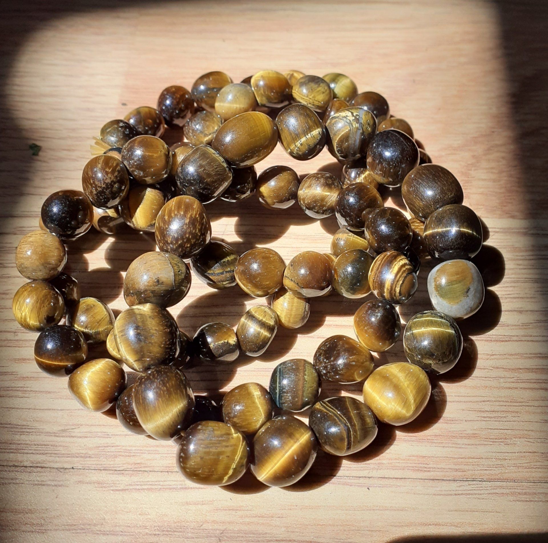 L' Oeil de tigre est brun à bandes dorées effet chatoyant, relfèt de bandes ondulées.